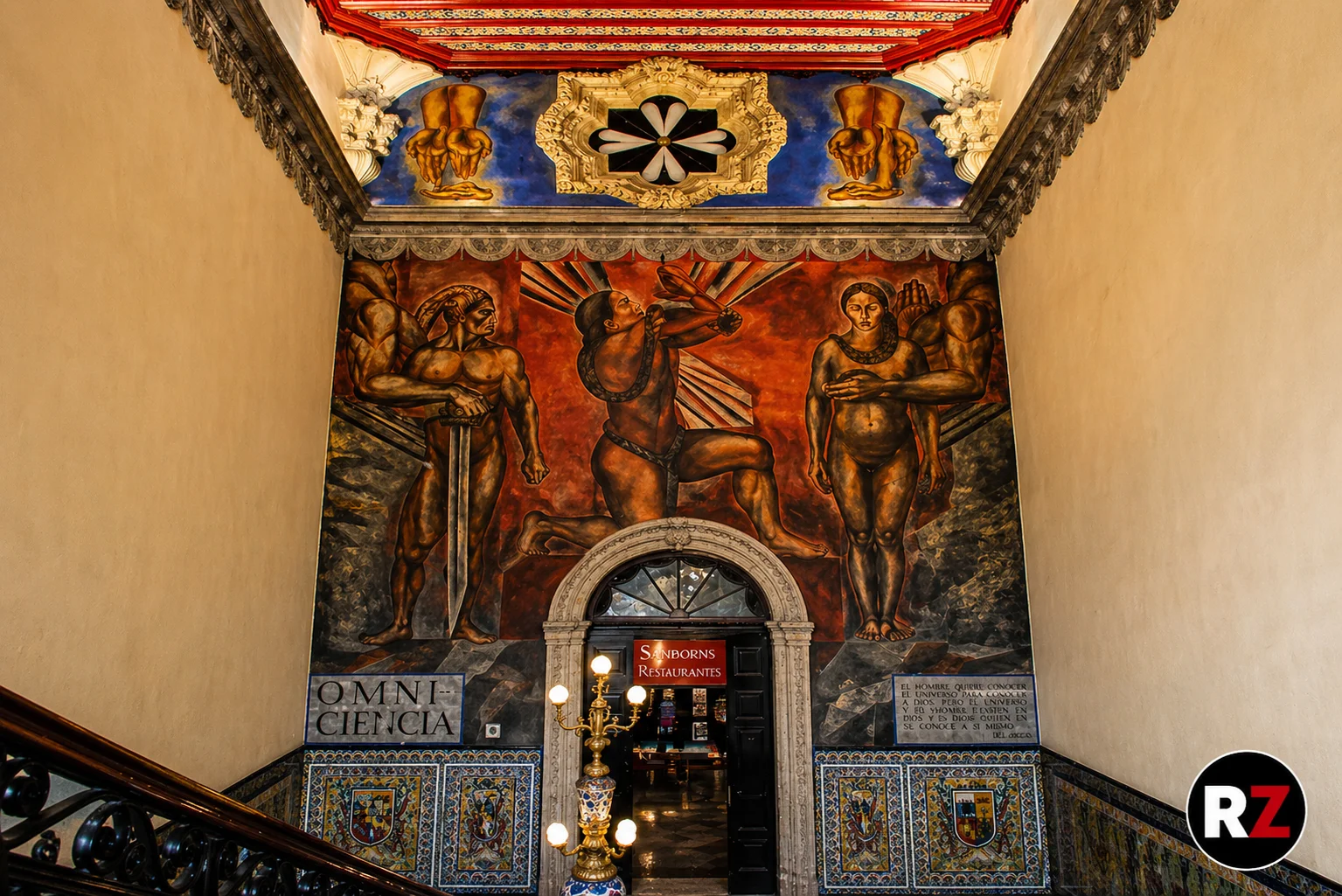 Uno de los elementos más destacados de la Casa de los Azulejos Ciudad de México es el mural “Omnisciencia”, obra del reconocido artista mexicano José Clemente Orozco. Ubicada en el interior del edificio, esta pieza introduce una dimensión artística que trasciende lo decorativo y conecta directamente con las grandes corrientes del muralismo mexicano.